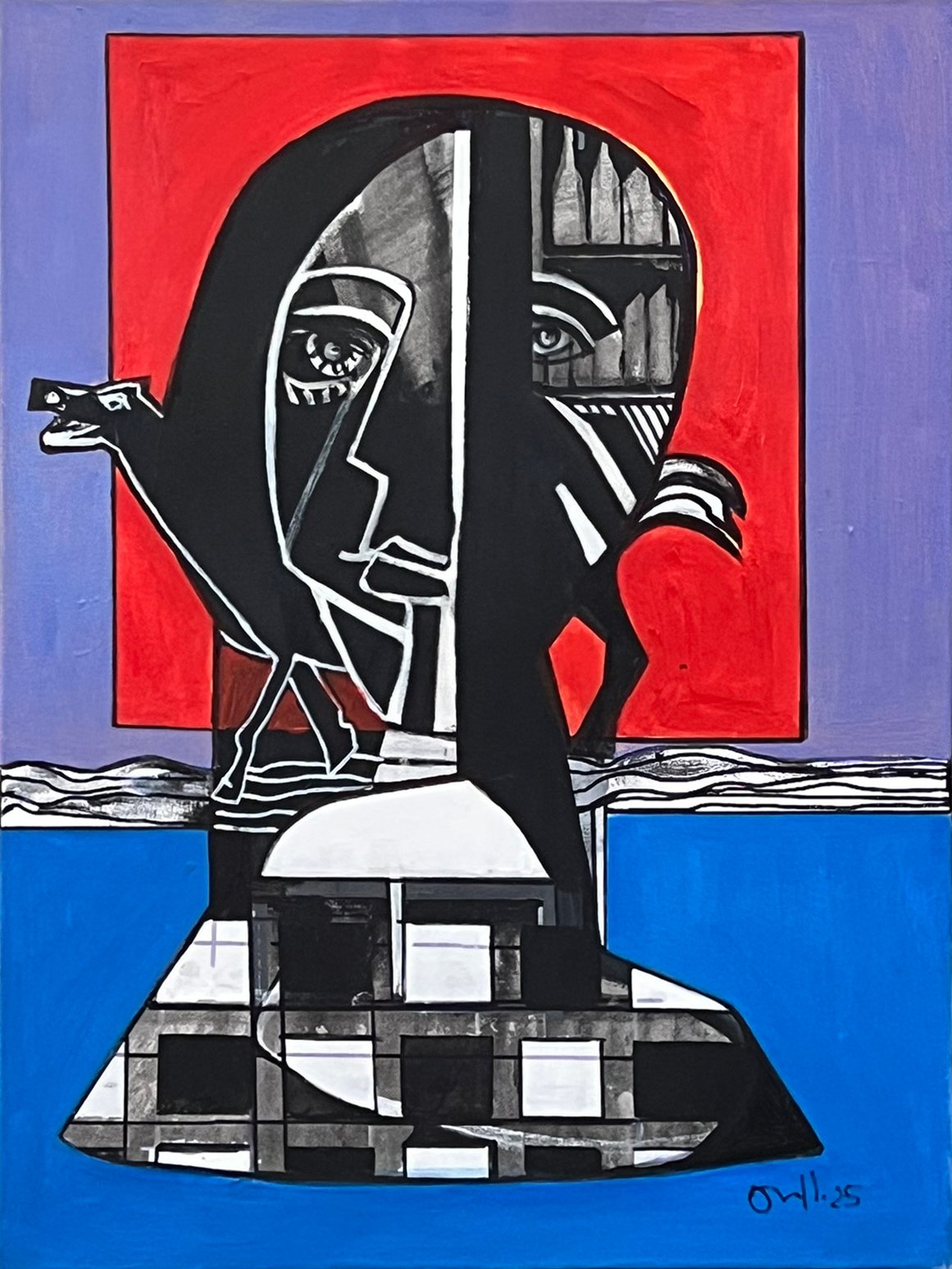 El contraste entre el rojo intenso y los tonos fríos articula la tensión entre lo visible y lo oculto, entre lo que transcurre y lo que permanece. La obra sugiere un equilibrio frágil entre opuestos: día y noche, vigilia y sueño, presencia y misterio.