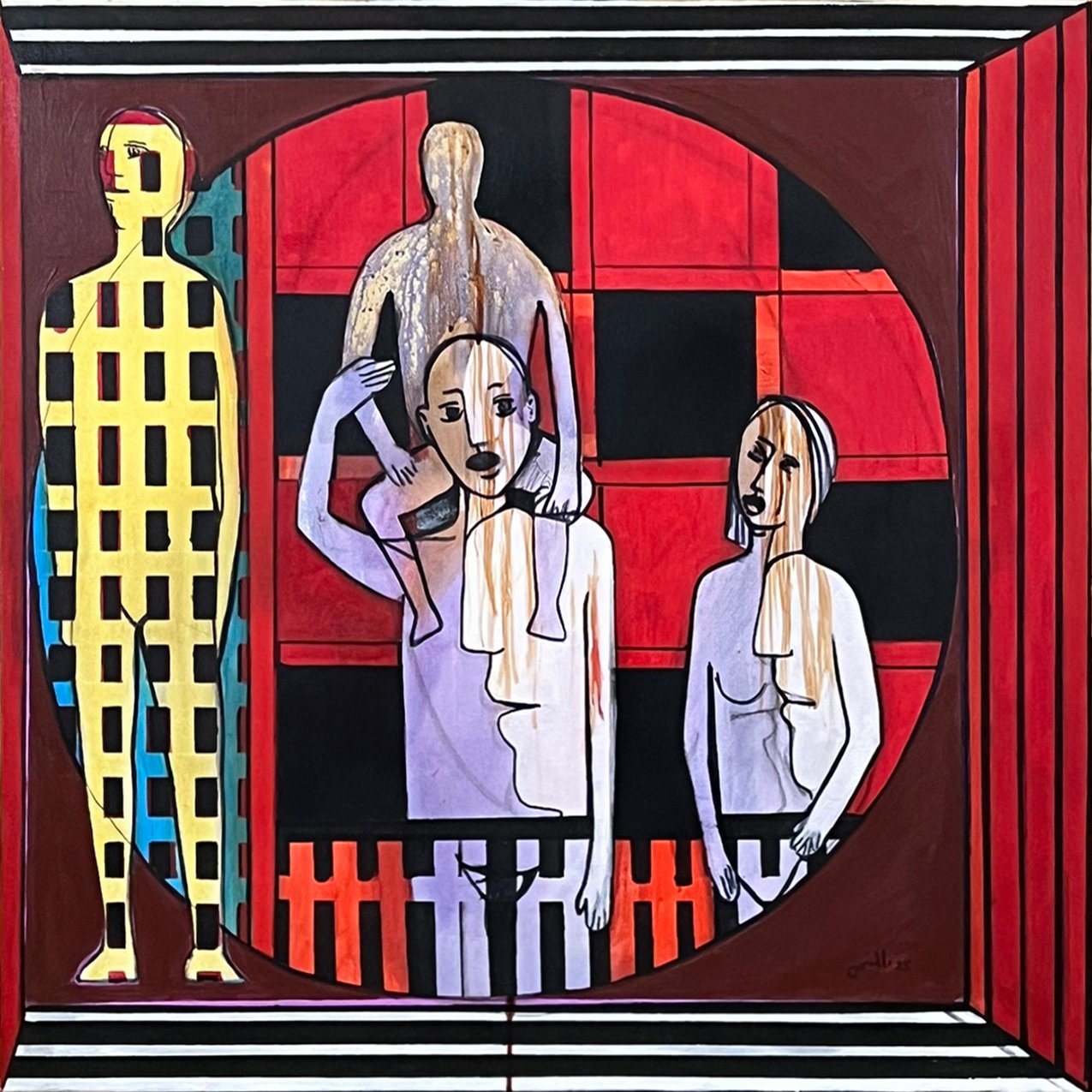 Figuras detenidas en un umbral donde pasado y presente conviven. Sus cuerpos, fragmentados y serenos, habitan un espacio de silencio y memoria. Entre rojos latentes y azules profundos, la escena no avanza: permanece, suspendida en una espera íntima y sin desenlace.