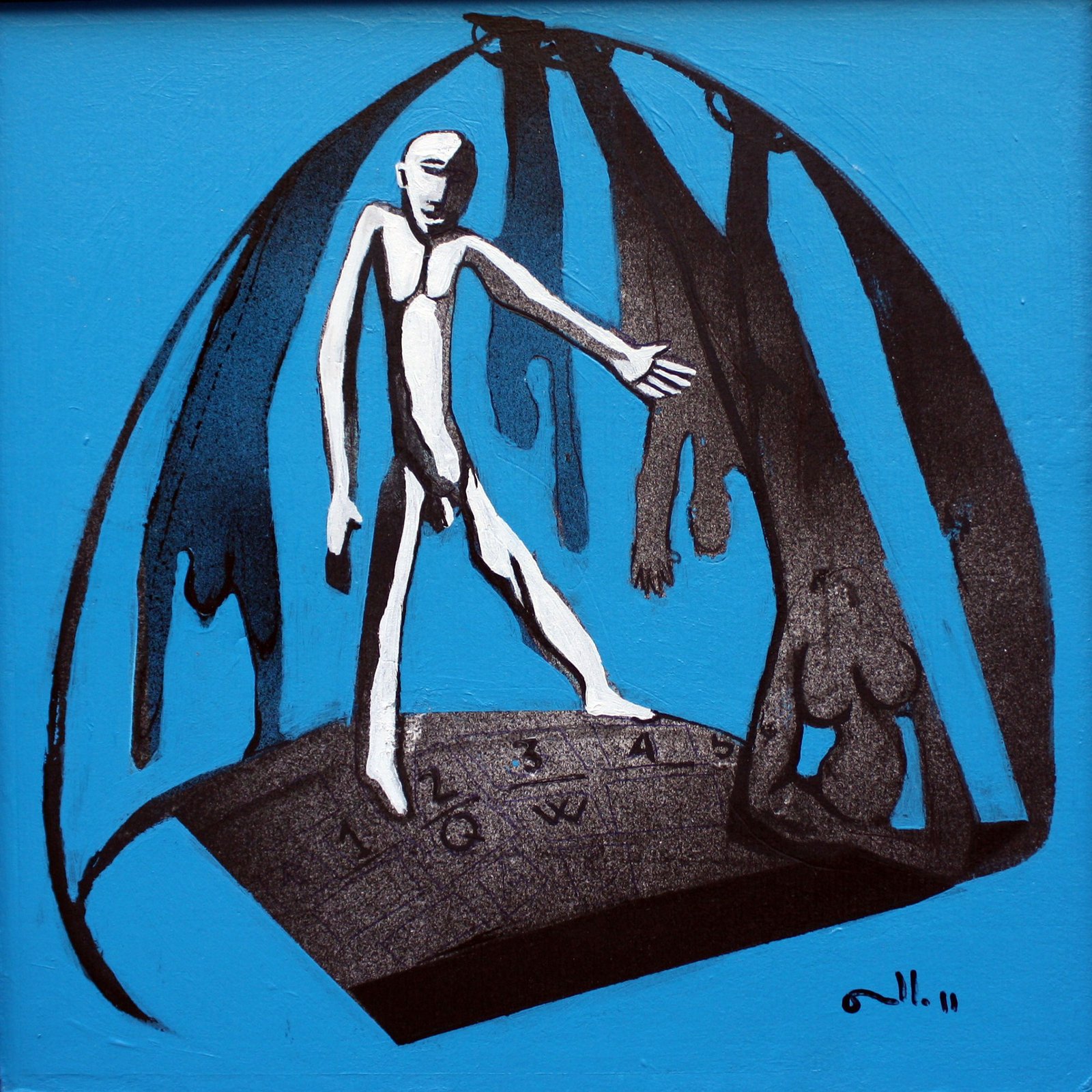 El contraste entre el azul intenso del fondo y el negro expresivo del trazo otorga fuerza dramática a la escena. La simplicidad formal se transforma en una poderosa metáfora del equilibrio precario entre presencia y ausencia, una constante en la poética visual del artista.