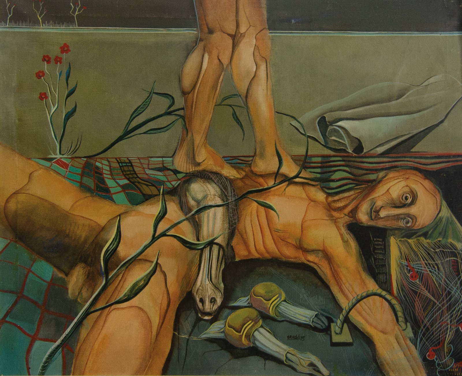 1975. En esta obra temprana, Roberto Orallo despliega una visión profundamente humana y simbólica del cuerpo. La figura tendida, atravesada por líneas y elementos orgánicos, se convierte en una metáfora de la vulnerabilidad y del tránsito entre la vida y la memoria.