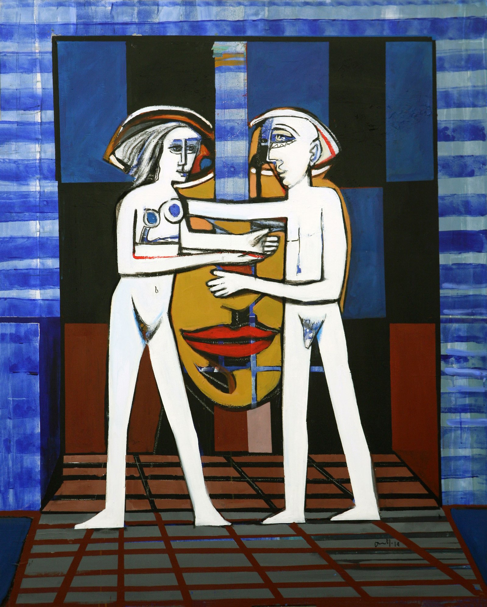 El fondo, un entramado de franjas azules, impone un ritmo visual vertical que recuerda a una partitura o a una serie de cortinas: separa y a la vez une, ordena y da ritmo a la composición. Sobre él, los personajes se recortan con contornos negros definidos, reducidos a lo esencial, pero no por ello carentes de emoción.