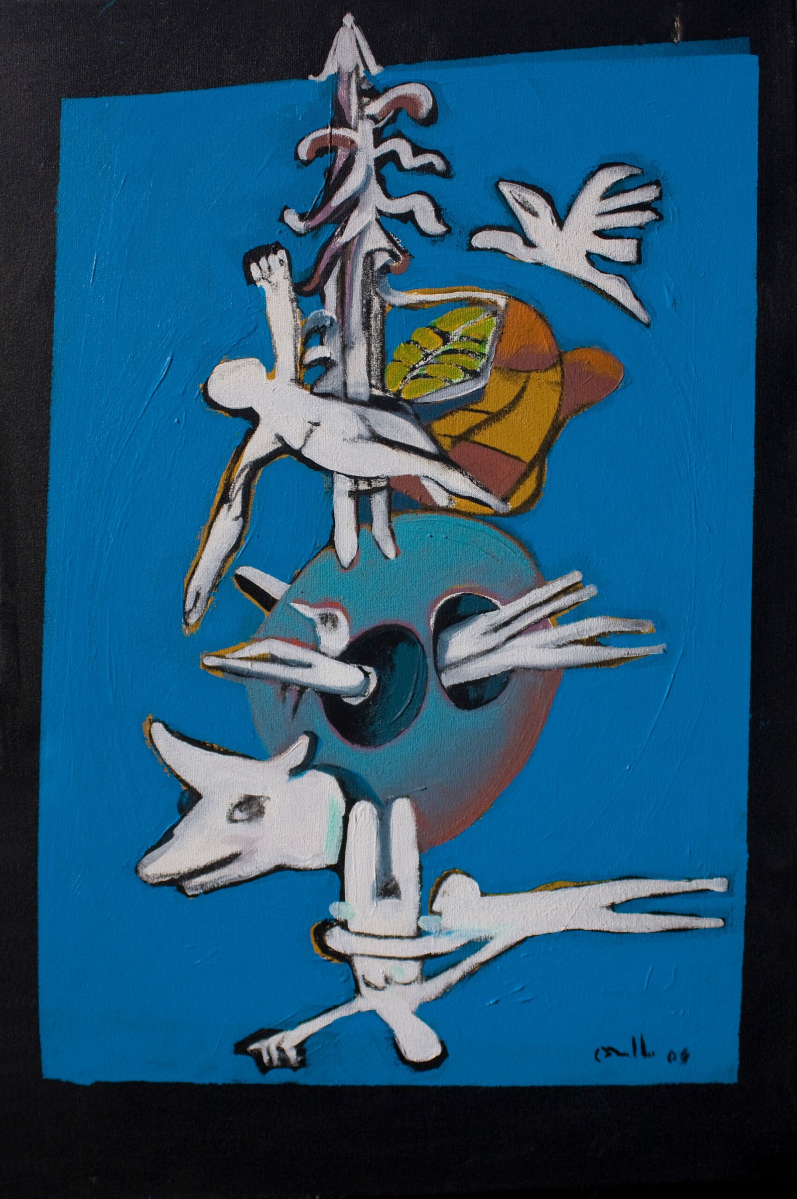 Roberto Orallo reinterpreta El jardín de las delicias de El Bosco desde una mirada contemporánea. Figuras blancas y espacios geométricos sobre fondos azules conforman una reflexión sobre el deseo, la culpa y la condición humana. La obra transforma el legado del Bosco en un diálogo entre pasado y presente.